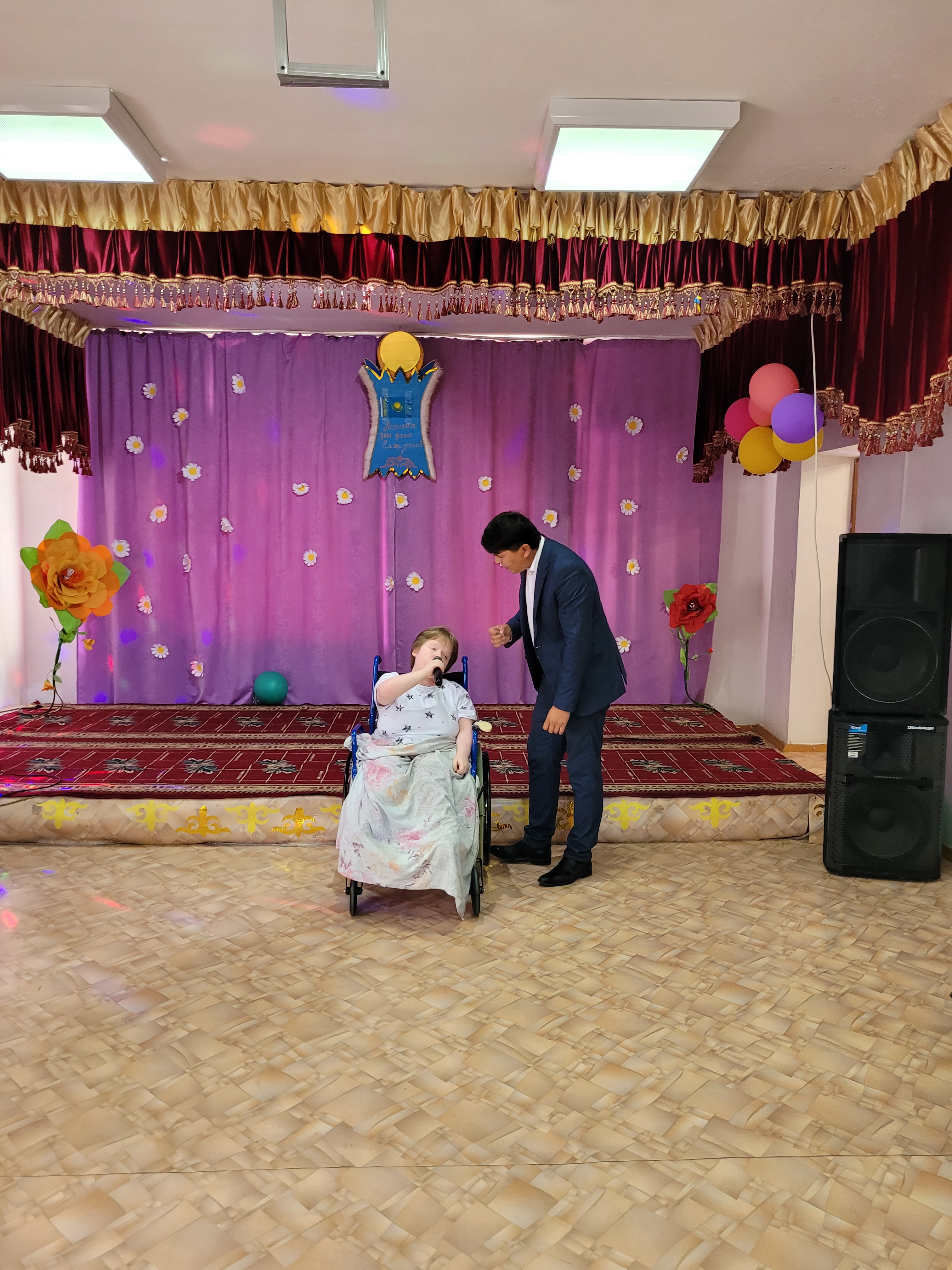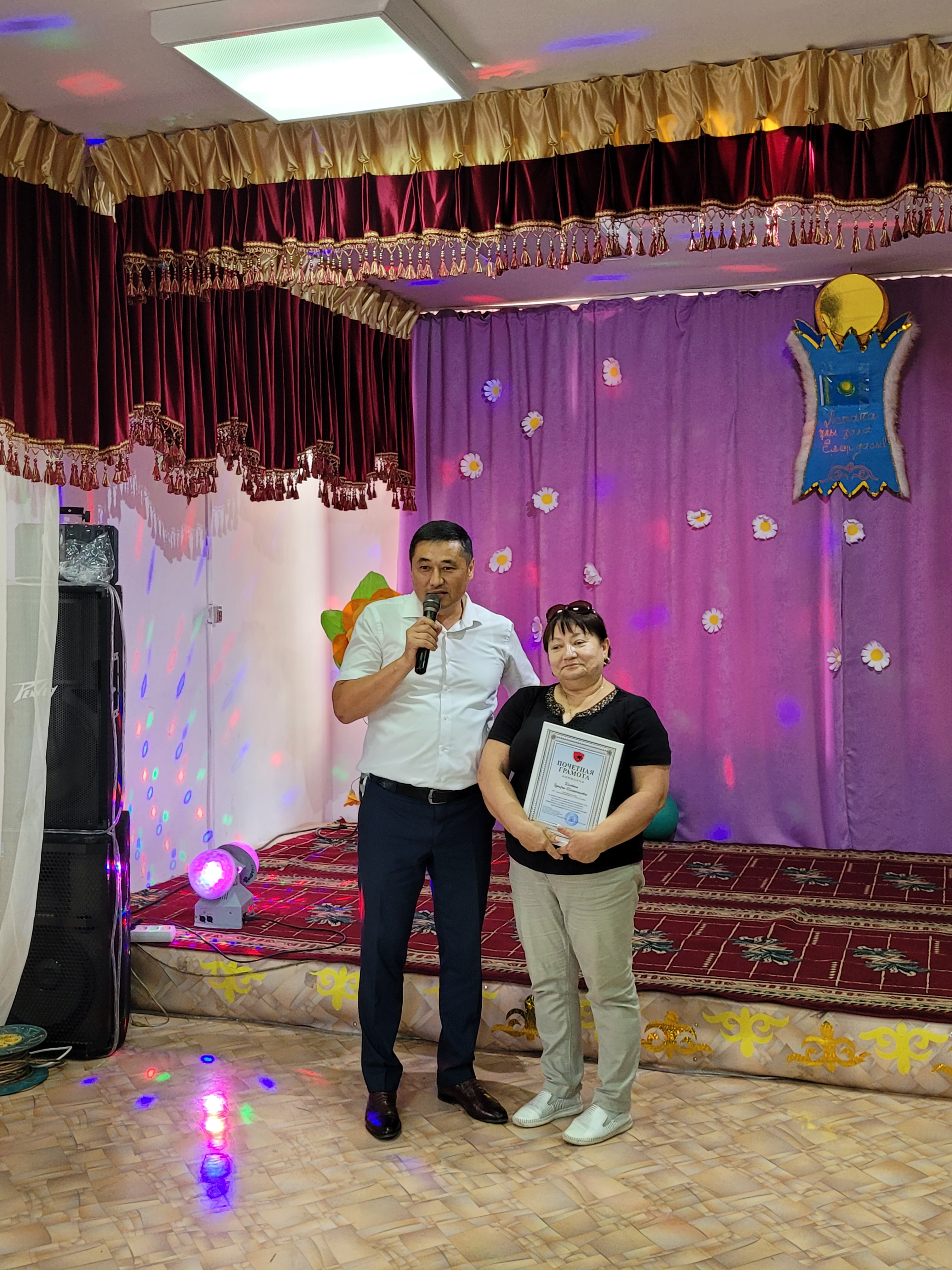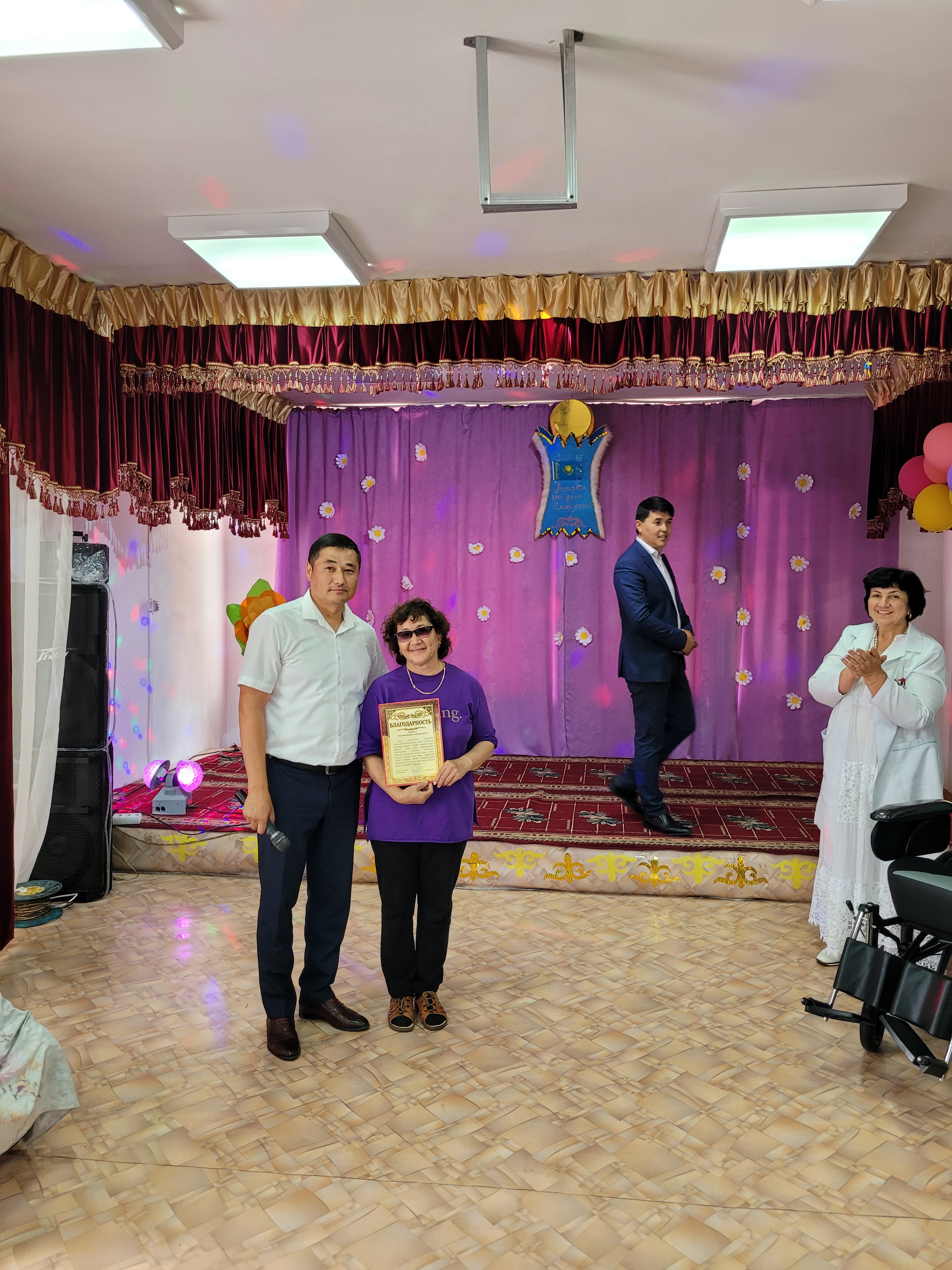 Мерекелік іс-шара қызметкерлер мен қызмет алушылар бірлескен үлкен шараға ұласып, мекеме директоры Асхат Назарбекұлының құттықтау және марапаттау рәсіміне жалғасты. Мекеме басшысы барлық қызмет алушыларды мерекелерімен құттықтап, үздік қызметкерлерге мадақтама қағаздарын табыс етті. Арнайы қызмет алушы Деревянко Дарьяға заманауи, жап-жаңа мүгедектерге арналған қол арба табыс етілді.